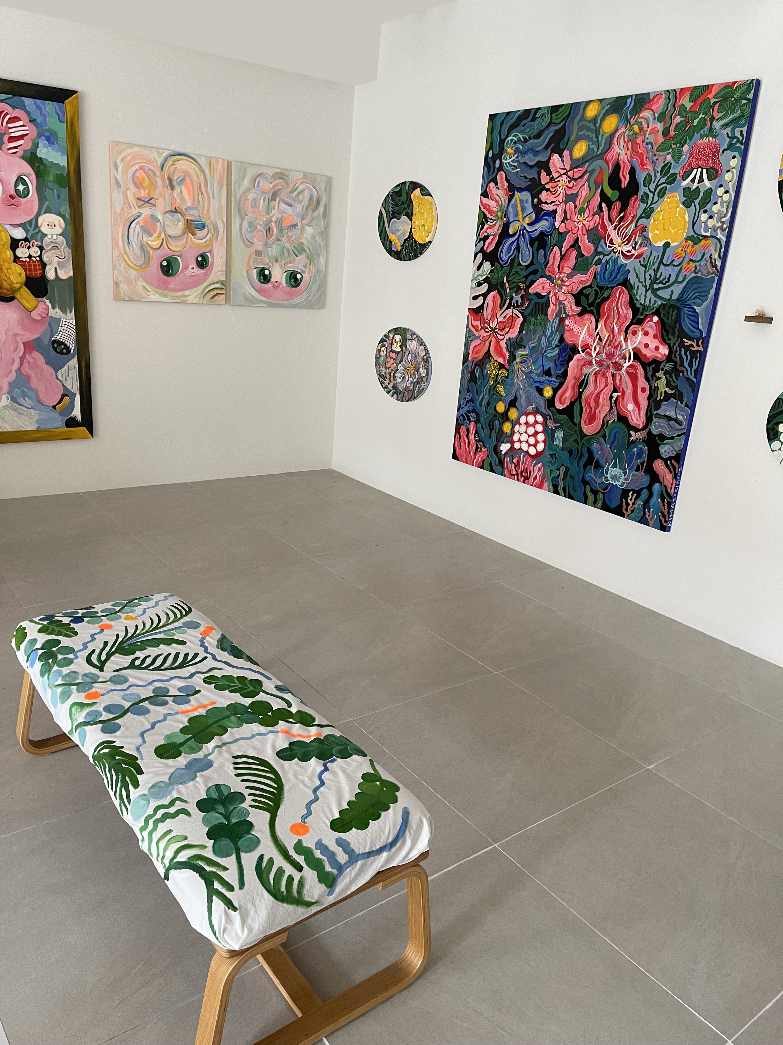 키마 작가는 꽃, 나무, 동물과 같은 자연을 자신만의 회화적 언어로 풀어내어 쾌활하고 풍성한 색채를 가진 신비로운 추상 세계를 만들어낸다.