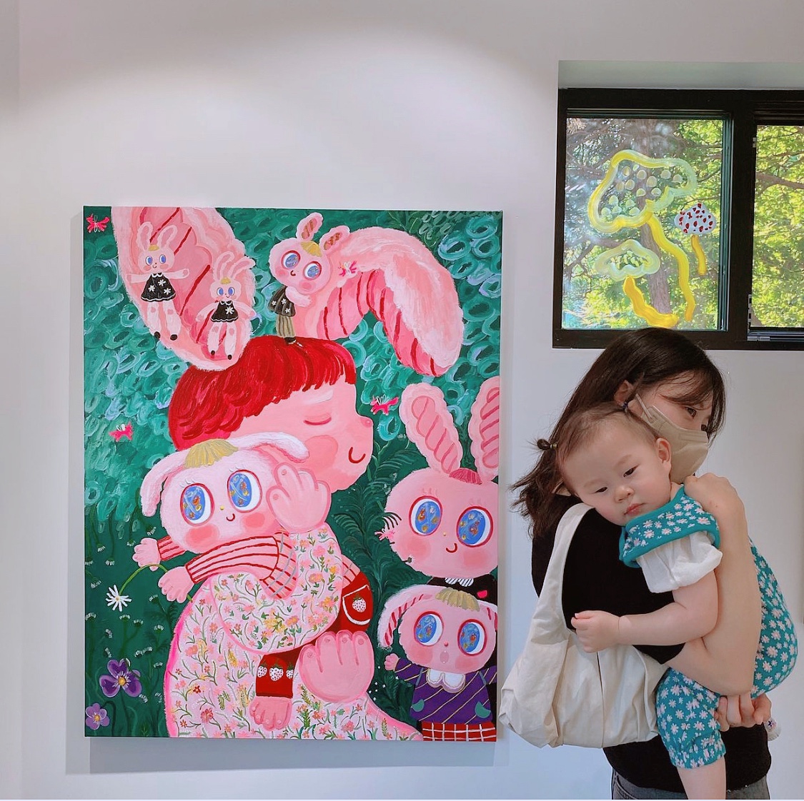 It is like breathing to observe nature and have affection to an artist who was born in a rural village hanok and spent her childhood surrounded by animals and nature. Kima’ mysterious imaginations are planted on the canvas through the artist's unconsciousness.